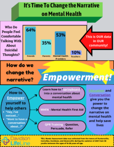 You can empower yourself through resources such as MHFA (Mental Health First Aid), QPR training (Question, Persuade, Refer), or by reading articles related to mental health. Together we can change the narrative by using our resources and empowering ourselves to be comfortable talking about mental health.