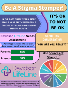 Davidson Lifeline has always been so fortunate to have incredible partnerships. Last summer two fabulous and ambitious students from the UNCC Master of Public Health program, Alyssa Benziger and Landis Wipper, created a Needs Assessment for our Lake Norman community, designed to measure mental health concerns and care availability for young people aged 15-24 in our region. The results were a fascinating and sobering snapshot of how we are meeting, and not meeting, their needs. This summer, we again are lucky to have Jeff Maenner, also a UNCC Master of Public Health student, who is creating blog posts, social media posts and videos to help us disseminate the information.